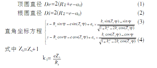 擺線輪齒廓是一條完整的短幅外擺線等距曲線,該曲線由擺線輪齒數Za.偏心距e、針齒半徑a0和針齒分布圓半徑Rz等參數組成。其曲線直角坐標方程和頂圓直徑方程、根圓直徑方程如下: