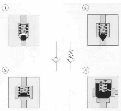 單向閥(止回閥)的主要功能是在一個(gè)方向阻止油液的流動(dòng),而在反方向則實(shí)現(xiàn)自由流動(dòng)。阻止流動(dòng)必需無泄漏,因而這類閥總是采用座閥結(jié)構(gòu)。密封元件有鋼球(1),錐閥芯(2),閥座(3)和插裝閥(4)幾種類型。只需很小的液壓力,密封元件就可克服彈簧力而開啟閥門。圖1表示這一基本原理。
